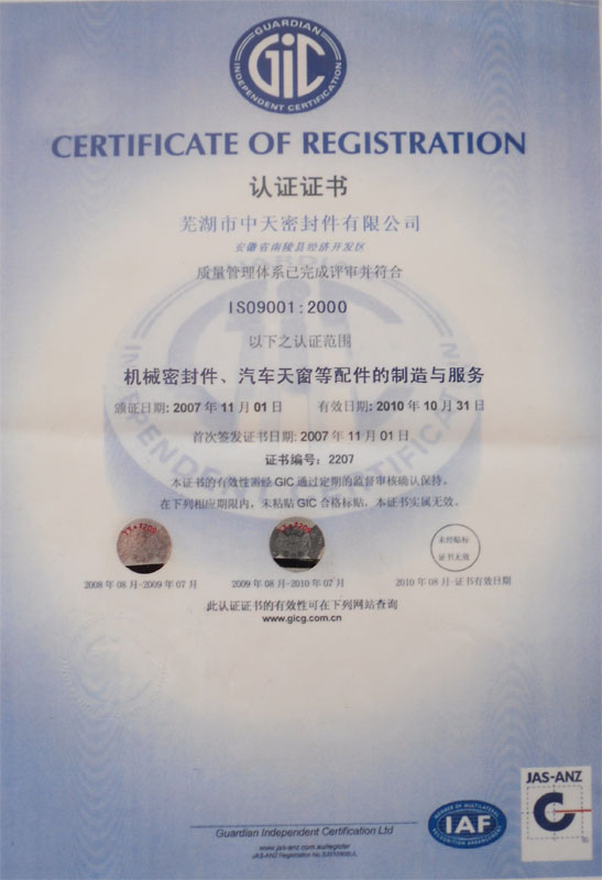 ISO9001:2000質量管理體系認證證書